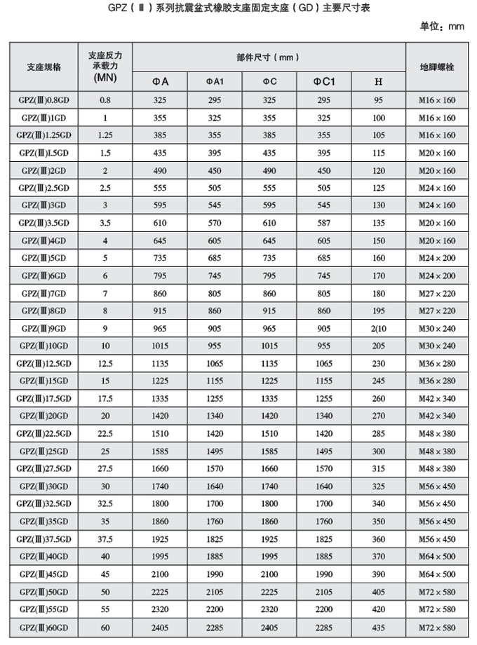盆式橡膠支座的標(biāo)記一支座型式,GDR表固定支座;DX代表單向活動(dòng)支座 一支座允許承載力,單位:MN