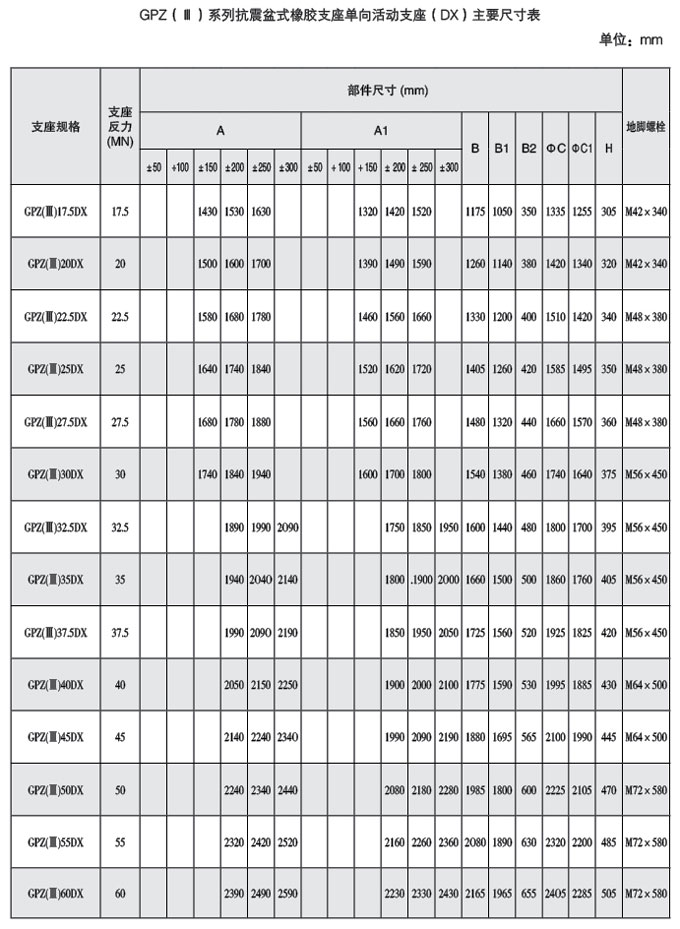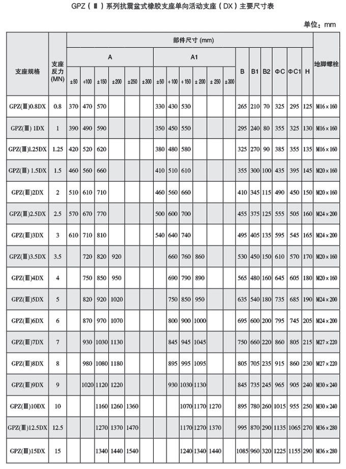 盆式橡膠支座按其使用時(shí)的位移能力分為二類,即單向活動(dòng)支座具有豎向 轉(zhuǎn)角功能和單一方向位移功能,代號(hào)DX;