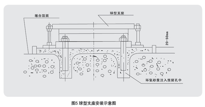 a安裝支座板及地腳螵栓:在下支座板四角用鋼楔塊調(diào)整支座水平,并使下支座板底面髙出橋嫌頂面20 50mm,找正支座縱、橫中線的位置,使之符合設(shè)計(jì)要求。用環(huán)氣樹(shù)脂砂漿灌注地腳嫌栓孔及支座底面墊層。 (圖5 )